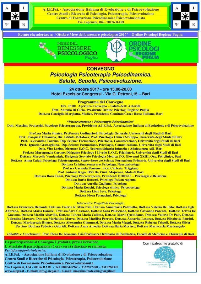 Iscritto all’Albo dell’Ordine degli Psicologi della Regione Puglia con il n. 233 e data di iscrizione 07/12/1989, con esercizio dell’attività psicoterapeutica.