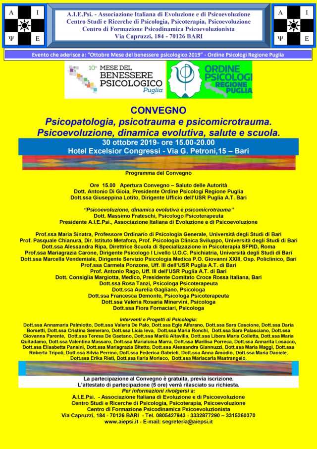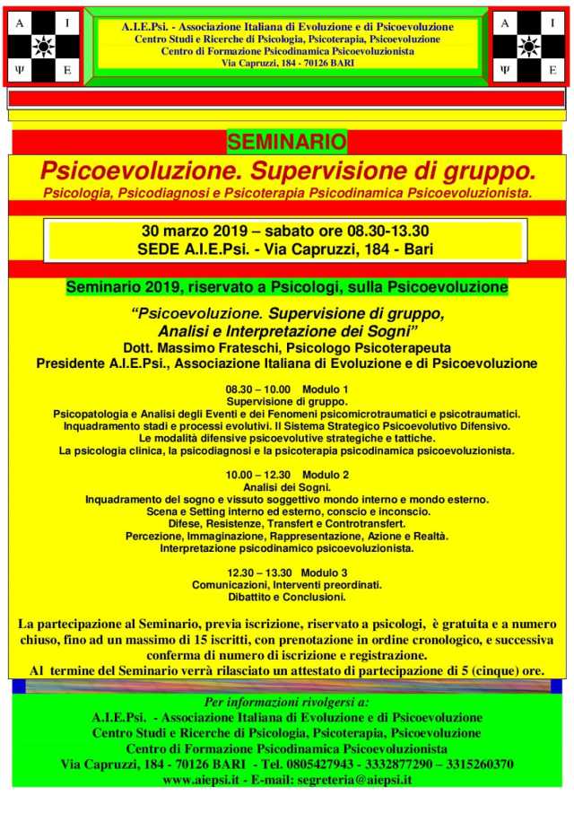Iscritto all’Albo dell’Ordine degli Psicologi della Regione Puglia con il n. 233 e data di iscrizione 07/12/1989, con esercizio dell’attività psicoterapeutica.